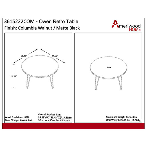 Verleihen Sie Ihrem Wohnzimmer mit dem runden Retro-Couchtisch »Owen« einen lustigen Retro-Look. Die schwarzen Beine im Haarnadel-Stil sind im Mid-Century-Design gefertigt und bieten ein industrielles Gefühl, während das Distressed-Grau mit braunem Unterton der runden Tischplatte eine rustikale Note verleiht, die zu jedem Stil passt. Die große Tischplatte bietet viel Platz zum Abstellen von Büchern, Zeitschriften, Fernbedienungen und Dekorationen. Der aus laminierter Spanplatte gefertigte Tisch erfordert nur eine minimale Montage. Für den Aufbau werden zwei Erwachsene empfohlen.